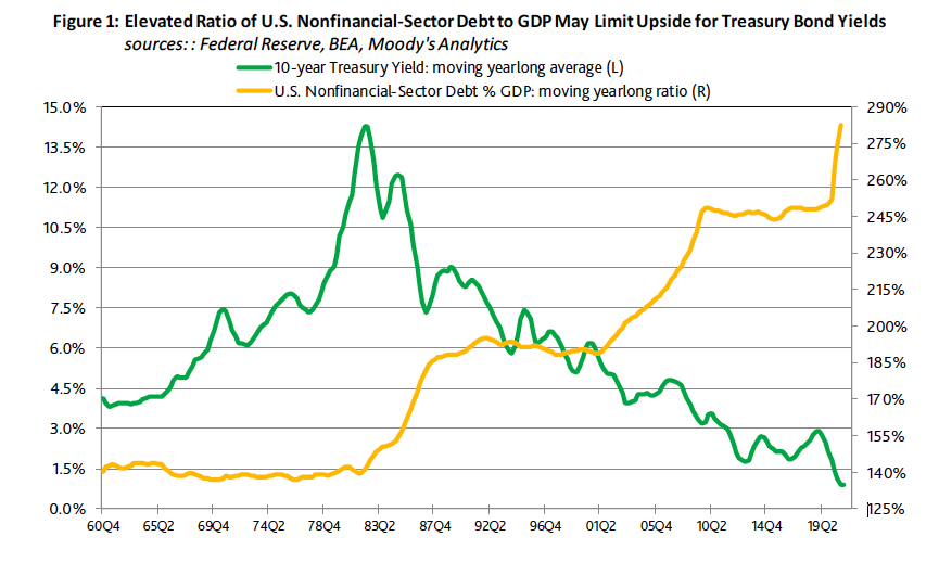The secular decline by Treasury bond yields since 1982 has been accompanied by a secular climb in the ratio of private and public non financial-sector debt to GDP. Basically, as benchmark interest rates have declined to help maintain a satisfactory pace for business activity, the private and public sectors have assumed more debt relative to underlying expenditures. Furthermore, as indebtedness increases relative to the business activity that funds debt servicing obligations,less of an increase in benchmark interest rates is required for the purpose of warding off an inflationary pace of spending growth. Also reinforcing the bias toward lower interest rates would be how deeper declines by benchmark interest rates may be required for the purpose of significantly enlivening business activity at higher ratios of total debt to GDP.As the 10-year Treasury yield’s moving yearlong average sank from second-quarter 1982’s record-high 14.29%to the 0.89% of 2020’s final quarter, the moving yearlong ratio of total U.S. private and public non financial sector debt to GDP climbed from 143% to a record 283%. Prior to COVID-19, fourth-quarter 2019's ratio equaled 250%.