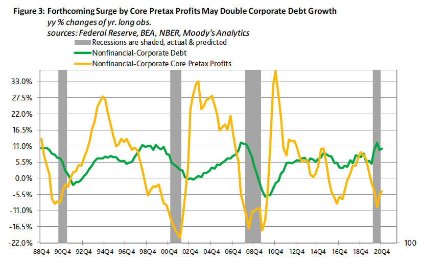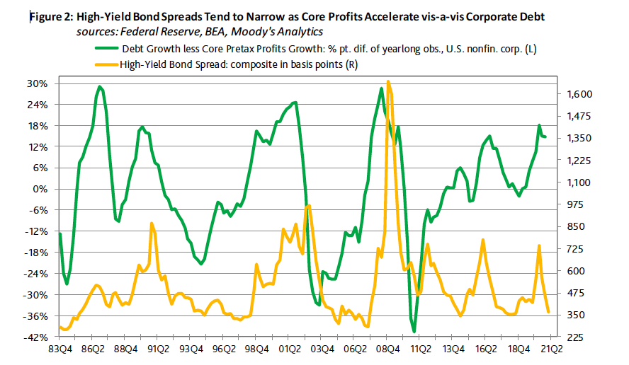 A post-recession acceleration of corporate debt may not obviate a narrowing of corporate bond yield spreads if accompanied by an even faster acceleration of core profits. The calendar-year average of a composite high yield bond spread narrowed from 1983’s 329 basis points to 1984’s 290 bp despite an acceleration by the annual average growth rate of nonfinancial-corporate debt from 8.6% to 14.4% mostly because of an accompanying acceleration by core profits growth from 21.5% to 27.7%.Nevertheless, corporate credit quality is better served when corporate debt shrinks outright amid core profits growth. And that is precisely what occurred following the recessions of 1990-1991, 2001, and 2008-2009.